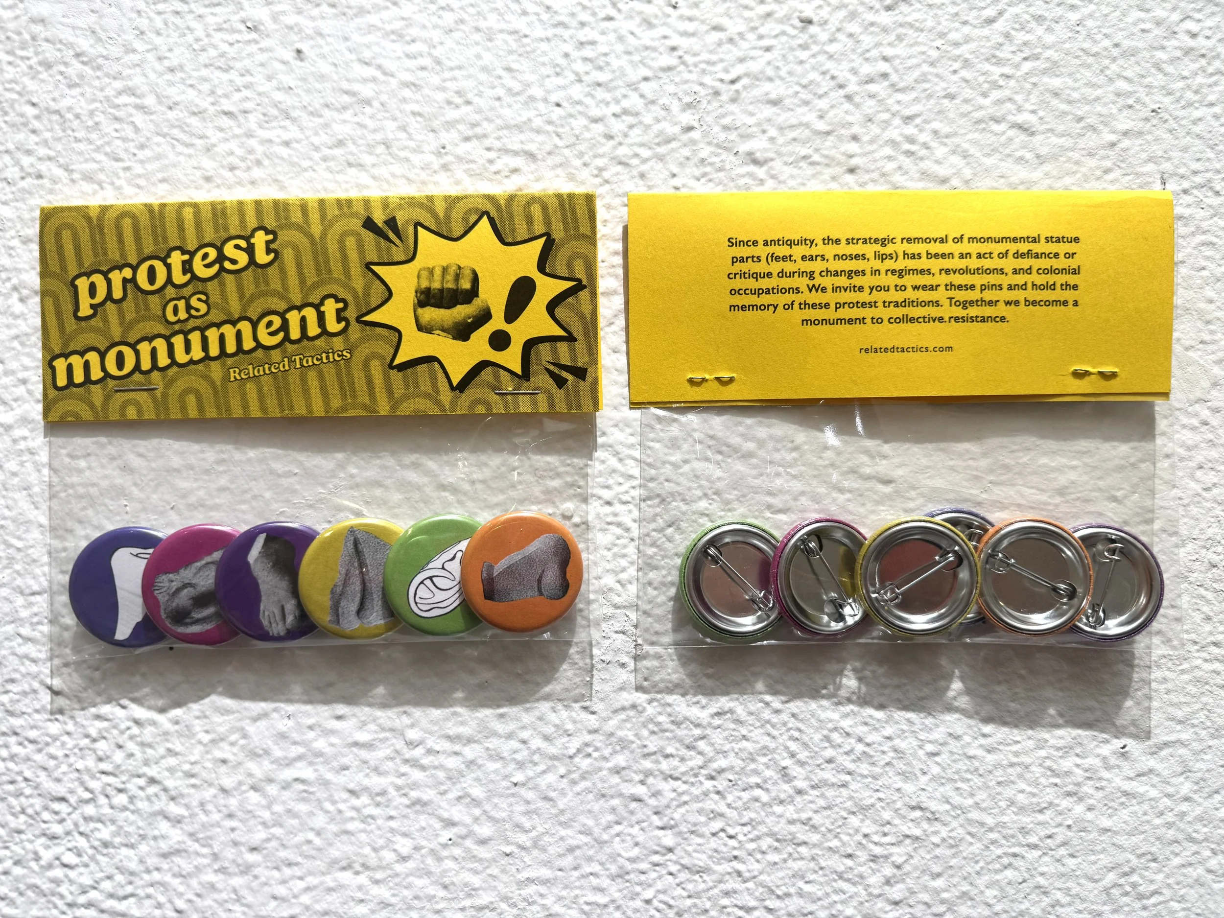 Since antiquity, the strategic removal of monumental statue parts (feet, ears, noses, lips) has been an act of defiance or critique during changes in regimes, revolutions, and colonial occupations. Protest As Monument invites you to wear these pins and hold the memory of these protest traditions. Together we become a monument to collective resistance.