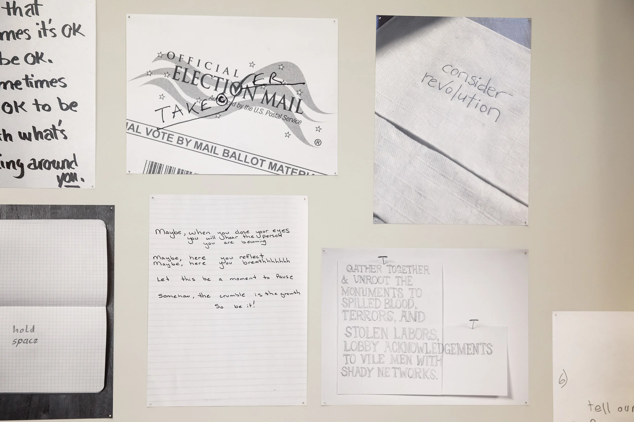 For the second iteration of Ready (originally installed at the Berkeley Arts Center, 2019) at the Wexner Center for the Arts as a part of Climate Changing: On Artists, Institutions, and the Social Environment, we invited fifteen artists from around the country to reflect with Related Tactics by creating short text pieces that describe critical actions or artists’ interventions that invite audiences to examine what it means to be ready to engage with and transform the state of our world. These creative actions, written in the artist’s own hand, were printed and displayed in the Wexner. A free print takeaway that collects all of the text pieces will be available so audiences can employ the interventions in their own communities and institutions.